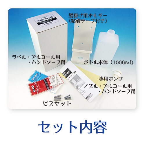 | 壁掛け用ホルダー(1個)、ボトル(1本)、ポンプ(1本)、ノズル(アルコール用、ハンドソープ用各1)、ラベル、ビス |