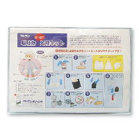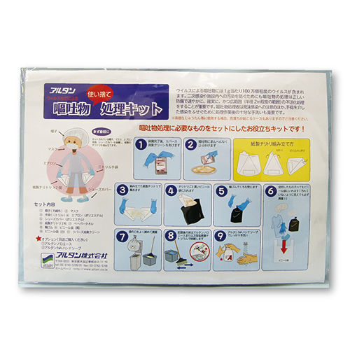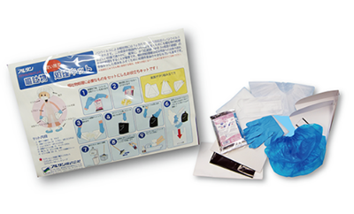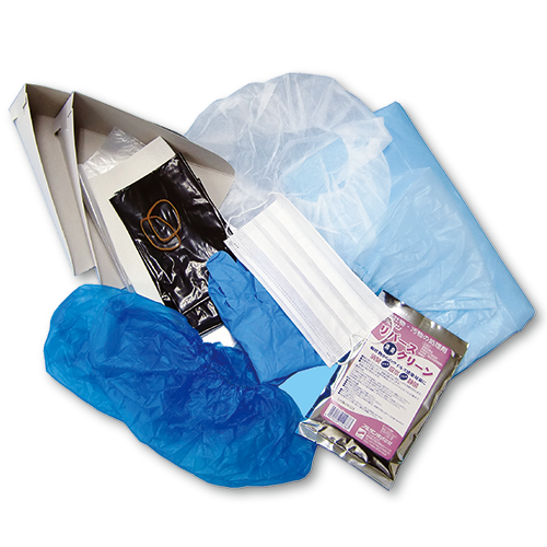 | ①帽子(不織布) ②マスク ③手袋 ④エプロン(ポリエステル) ⑤シューズカバー ⑥紙製チリトリ2枚 ⑦ペーパータオル ⑧輪ゴム ⑨ビニール袋(黒) ⑩ビニール袋(白) ⑪リバース消臭クリーン1袋 |