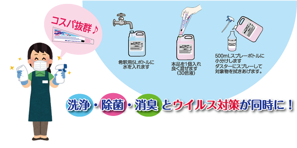 洗浄・除菌・消臭とウイルス対策が同時にできる中性洗剤。多くの人の手が触れる場所の拭き掃除にお使いいただけます。30倍濃縮タイプなので保管場所をとらずコストパフォーマンスも抜群です。