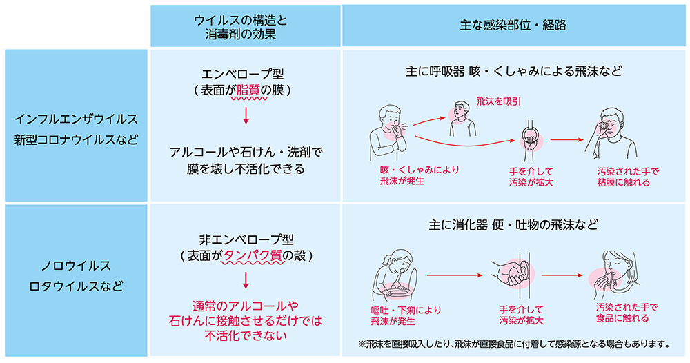 ノロウイルスと他のウイルスの違いに注目しながら、ノロウイルス特有の感染経路や有効な対策を整理しました。