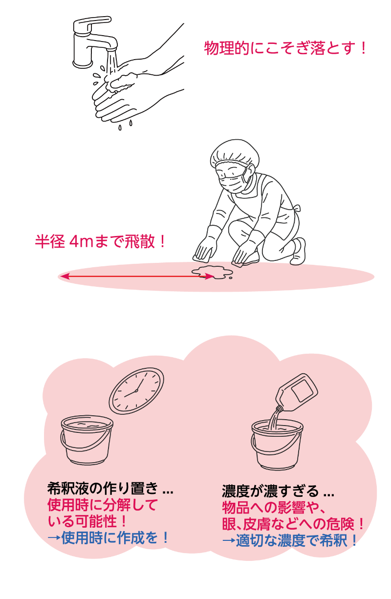 塩素系消毒剤(次亜塩素酸ナトリウム)はノロウイルスに有効ですが、希釈液を作り置きすると分解して効果が落ちるため、