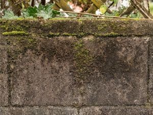 外壁にびっしりと生えているコケ、地衣植物をワンステップ・スプレー・クリーナーにて洗浄前と洗浄数日後の写真です。ブロック本来のきれいなレンガ色が映えます。
